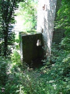 Zum Hang hin liegen die Überreste eines Gebäudes, das völlig asymmetrisch zu der strukturierten Burg stand. Es haben sich noch drei Außenwände, die drei Fenster und einen Türsturz aufweisen, erhalten. Die hintere Außenwand, Richtung Tal, ist bereits abgerutscht und verschwunden. Die Ecken des Gebäudes wurden mit großen Eckquadern versehen. Für viele Burgenforscher ein Hinweis, dass es sich um den Palas handelt. Die fensterlosen Fassaden und der unrepräsentative Aufbau in asymmetrischer Form deuten aber eher auf einen Lagerbau hin. Der Palas lag wahrscheinlich direkt unterhalb des Turms. Vom Wohnturm sondert sich noch eine Mauer ab, die mit knapp 1,5m Höhe der einzige Rest des Palas ist. Kleine eckige Fenster weisen darauf hin, dass auch sie nach außen zu der äußeren Wehranlage gehörte. Im Palas hat sich ein Zugang zu einem Gewölbekeller erhalten, der mit Betonplatten zugedeckt wurde.